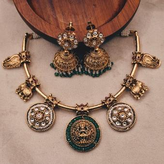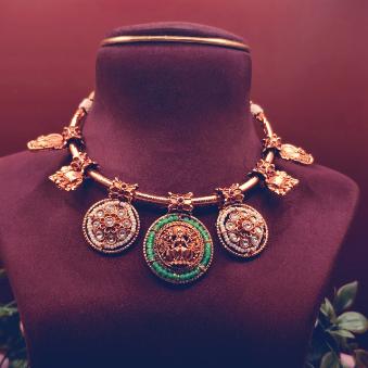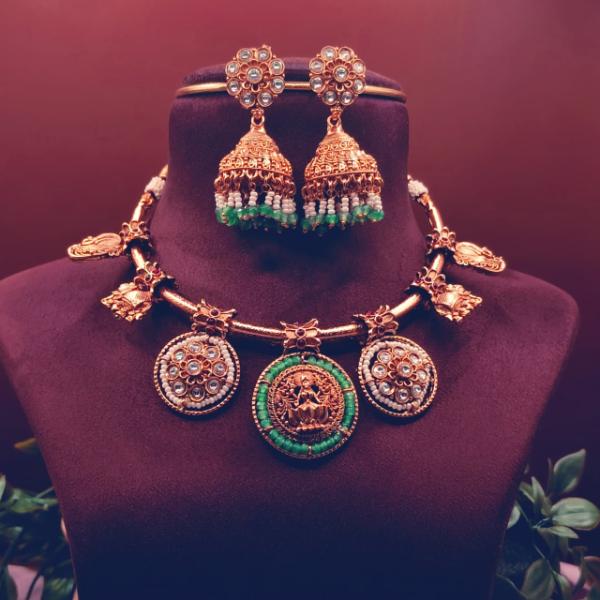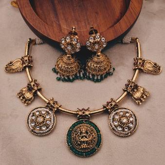 This is a classic Temple Jewellery set, a style originating from South India that is traditionally worn for weddings.
