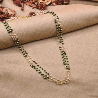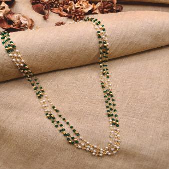 This piece is a classic three-layered beaded Mala, featuring a delicate alternation of metallic and textured beads. It carries a traditional yet lightweight aesthetic, making it versatile for both ethnic and fusion wear.