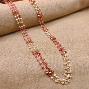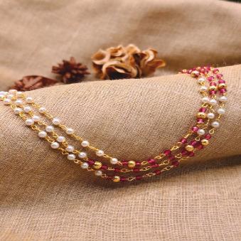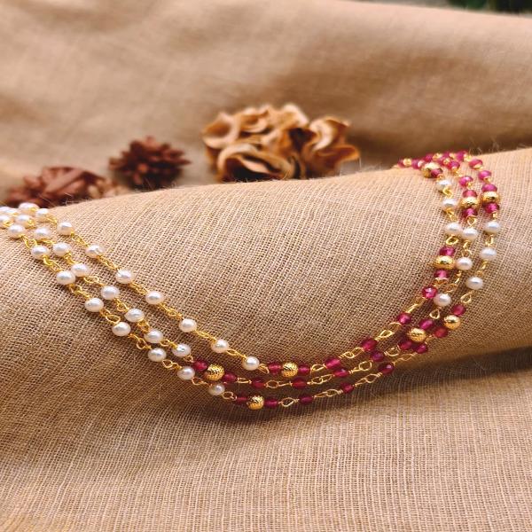 This piece is a classic three-layered beaded Mala, featuring a delicate alternation of metallic and textured beads. It carries a traditional yet lightweight aesthetic, making it versatile for both ethnic and fusion wear.