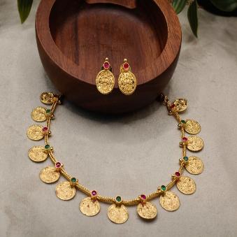 The image you provided features a traditional South Indian jewelry set known as a Kasu Mala (or Kasulaperu in Telugu). This style is iconic for its “garland of coins” design and is deeply rooted in heritage and auspiciousness.