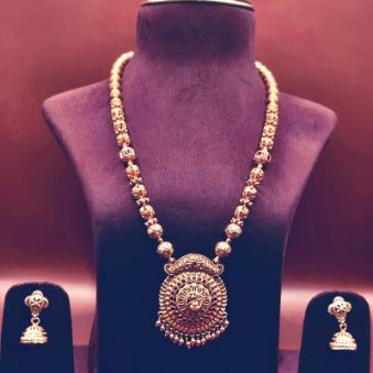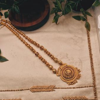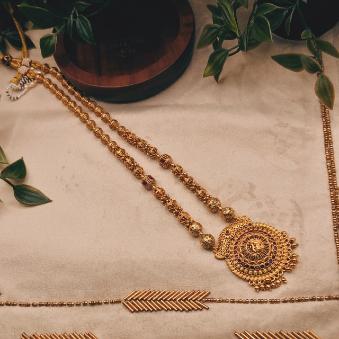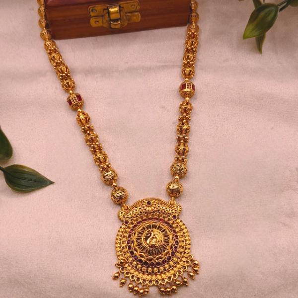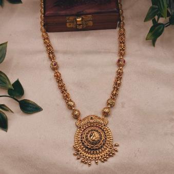 This neck piece is an example of traditional craftsmanship, featuring a single strand of heavy, ornate golden beads leading to a large, intricate circular pendant. The pendant has a radial, sunburst-like design with a central peacock or floral motif, finished with delicate bead droplets at the bottom.