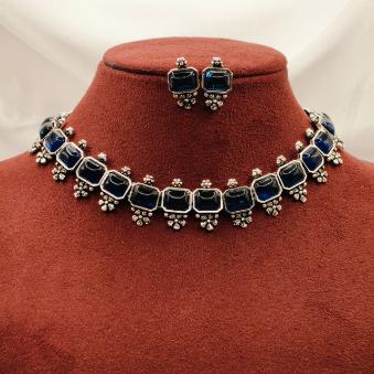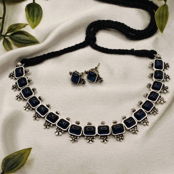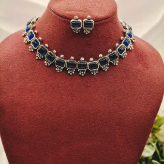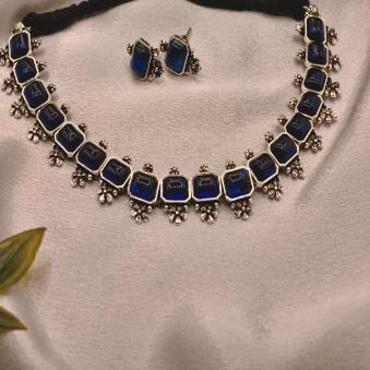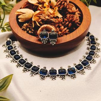 This elegant set features a contemporary take on oxidized silver jewelry, blending traditional craftsmanship with a bold, modern aesthetic. The deep blue square-cut stones serve as a striking focal point against the antique silver finish.