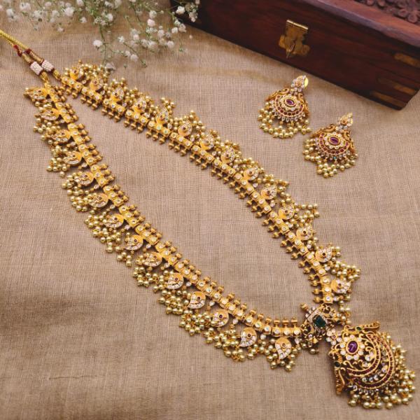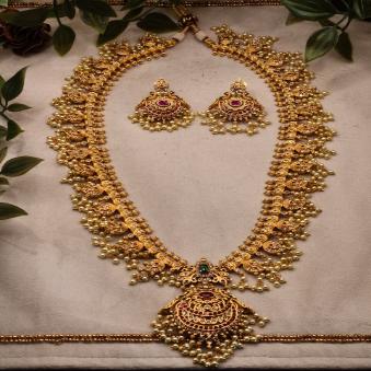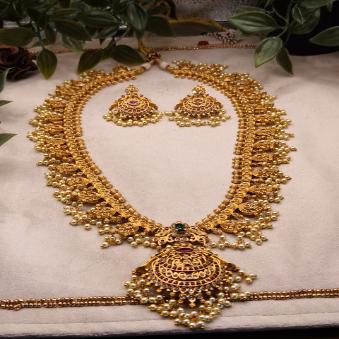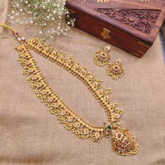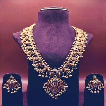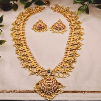 This beautiful haram is the full grandeur of traditional Indian craftsmanship. It is a Maha-Haar (grand long necklace), often used as the centerpiece of a bridal ensemble.