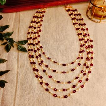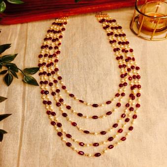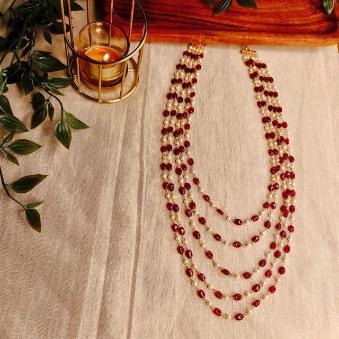 Handcrafted 5-Layer Red Bead and Pearl Mala Necklace