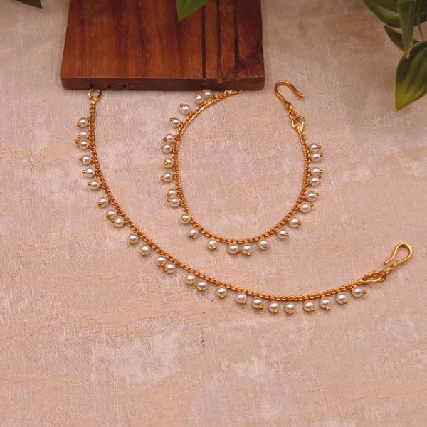 This image shows a pair of single-strand pearl ear chains, also known as Kaan Chains or Saharas these feature a sleek, single row of delicate white pearls on a golden-toned chain.