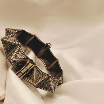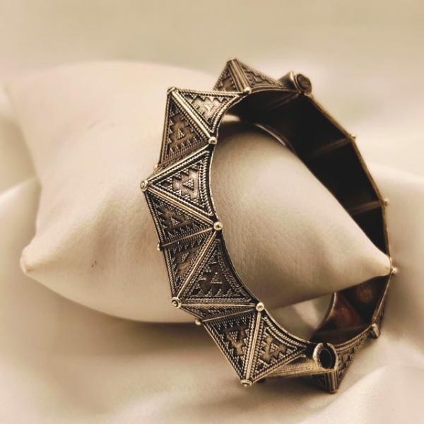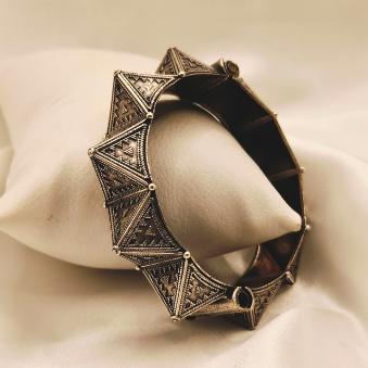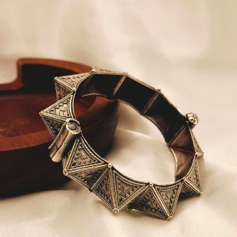 This geometric bangle has a sharp, avant-garde energy. Its repeated pyramid structure and oxidized finish give it an “urban warrior” or “architectural chic” aesthetic that is incredibly bold.