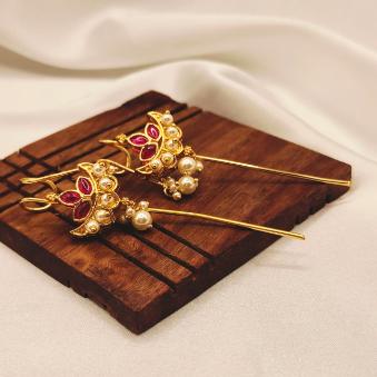 This ear cuffs are a beautiful blend of traditional craftsmanship and contemporary silhouette. The combination of the deep ruby-toned stones, delicate pearls, and the sleek style long bar gives them a very regal yet airy feel.