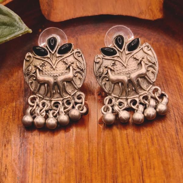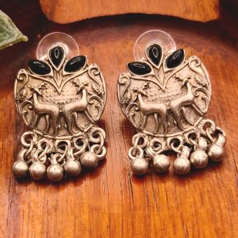 The dual deer motif (often representing harmony and nature) combined with the black onyx-style accents and ghungroo drops gives them a very soulful, artisanal feel.