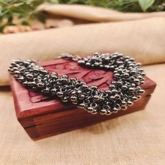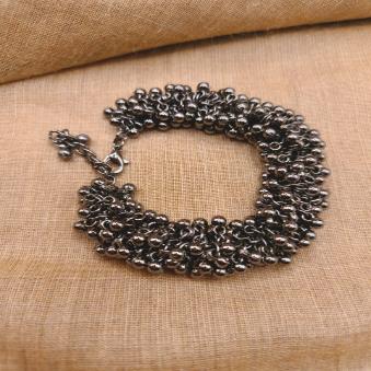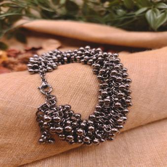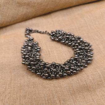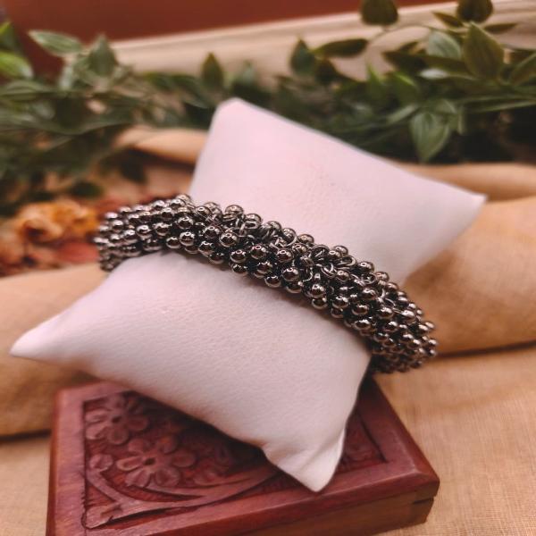 This oxidized silver-finish jewellery is a striking bracelet characterized by its antique, darkened patina and intricate “ghungroo” (small metallic bells) design.