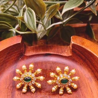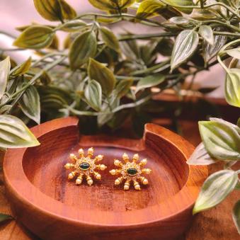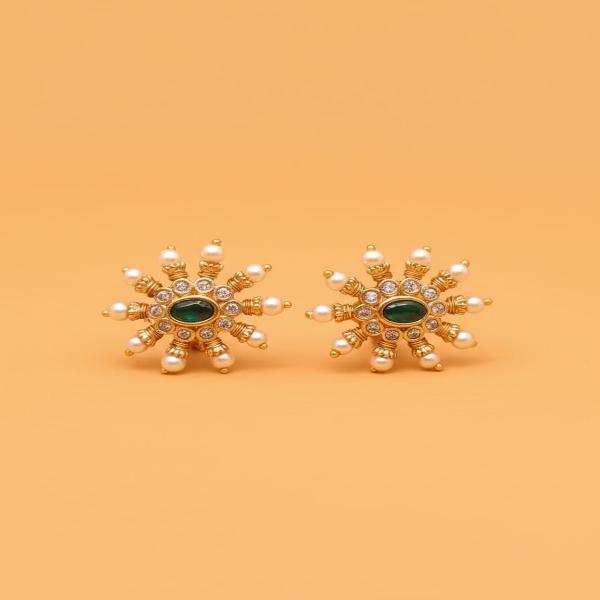 Those are a stunning pair of sunburst-style stud earrings, blending classic royal aesthetics with a bit of a celestial flair. They have a very “vintage-meets-traditional” vibe. A deep green, oval-cut stone—most likely emerald or green onyx—set in a bezel or prong setting.