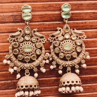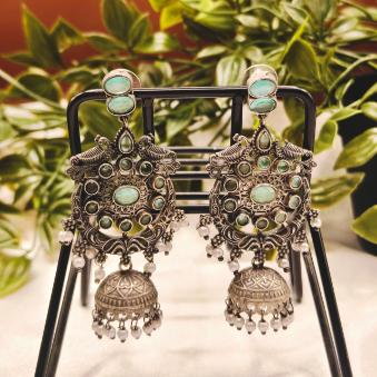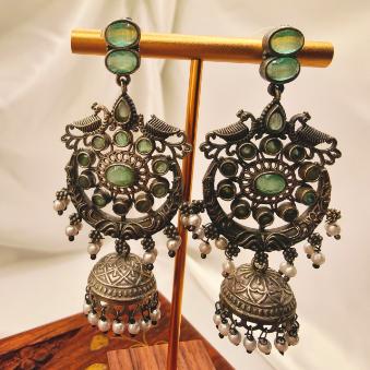 This is an Oxidized Silver Jhumkas featuring a fusion of traditional motifs and contemporary colour palettes.