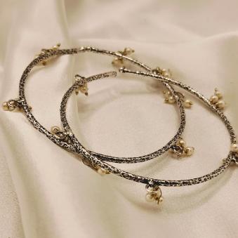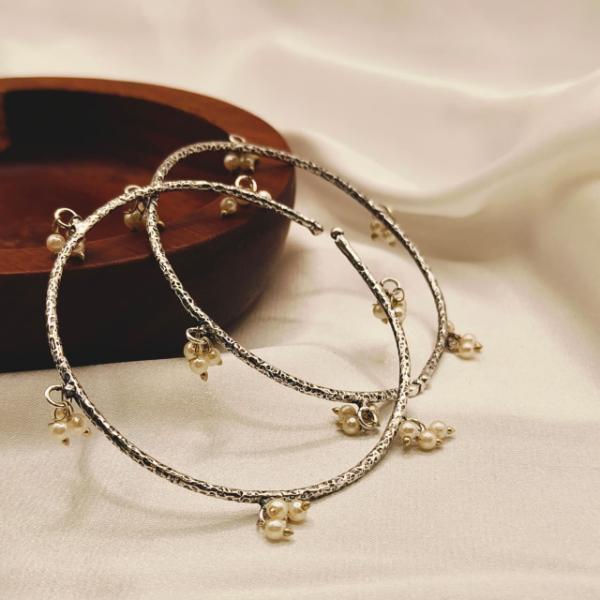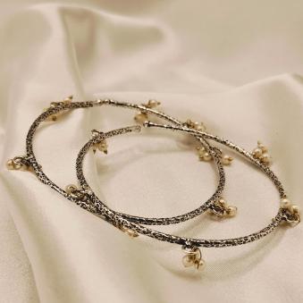 These bangles are beautifully bohemian and have a lovely “found treasure” quality. The oxidized, textured silver paired with the delicate pearl charms creates a soft, melodic aesthetic.